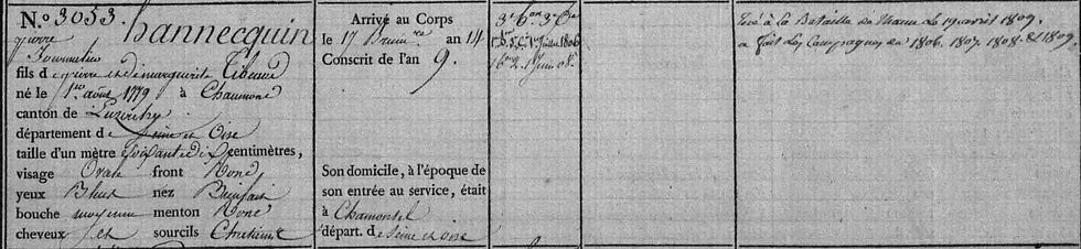 1e Bat./ 1e Co. Fusilier Pierre Nicolas Accard: Died of wouds in the Temporary Military hospital in Ulm on 30 June 1809